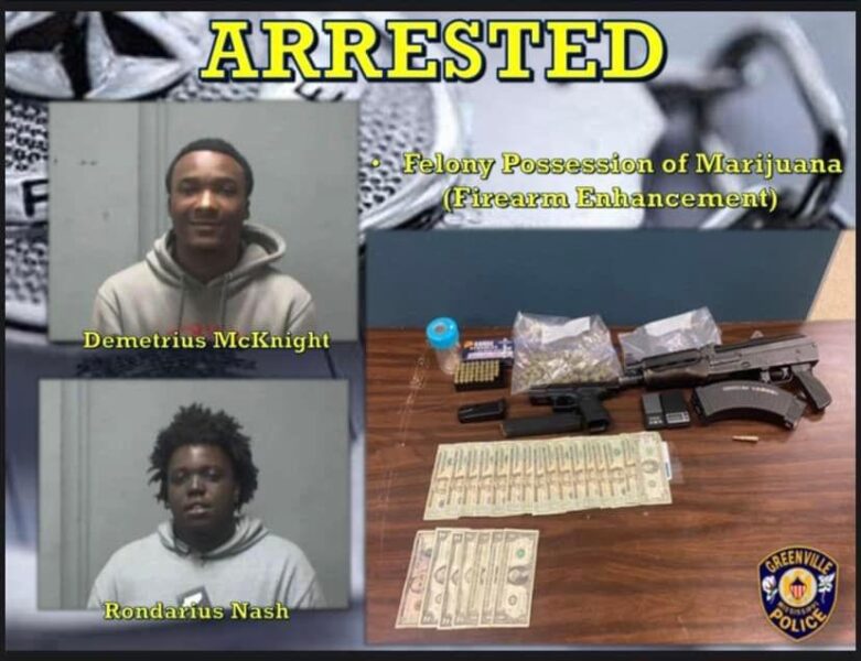 The Greenville Police Department performed a routine traffic stop in the 500blk of East Walker, which resulted in the arrest of Demetrius McKnight and Rondarius Nash on April 13th. The charges were Felony Possession of Marijuana and Firearm Enhancement. Both were being held in the Washington County Regional Correctional Facility on a $15,000 bond.