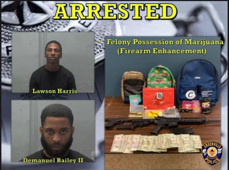 The Greenville Police Department arrests Lawson Harris and Demanuel Bailey II on a routine traffic stop in the 800blk of Walthall on April 14th. They were taken into custody and the charges were Felony Possession of Marijuana and Firearms Enghancement. Both were taken to the Washington County Regional Correctional Facility and given a $15,000 bond.